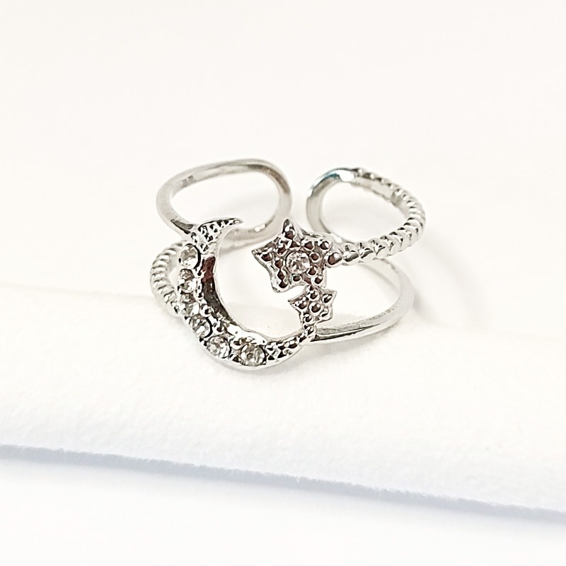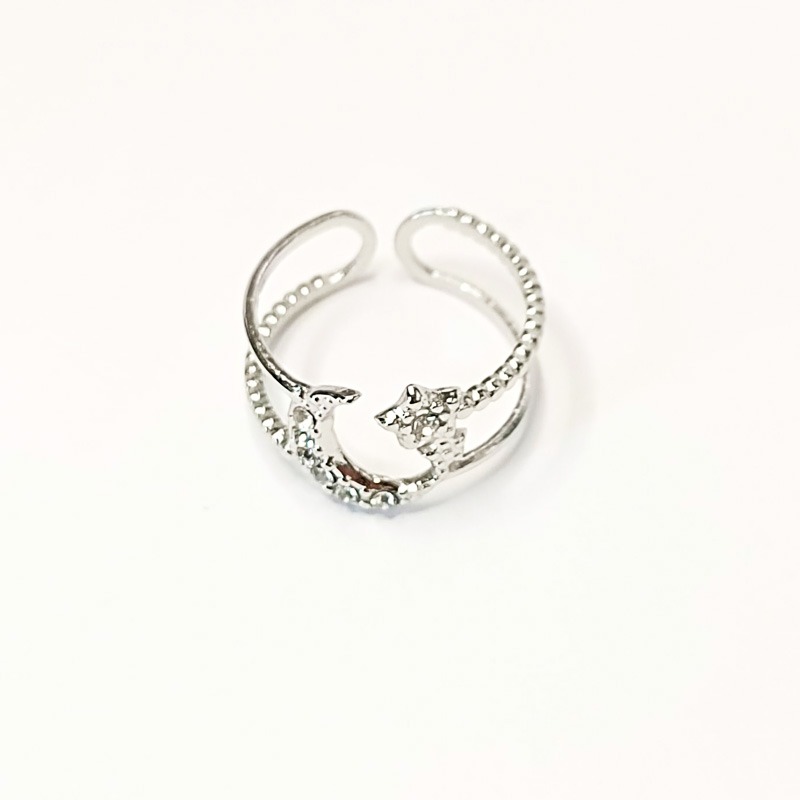 Anillo de acero ajustable color plateado con diseño de luna y estrella.
