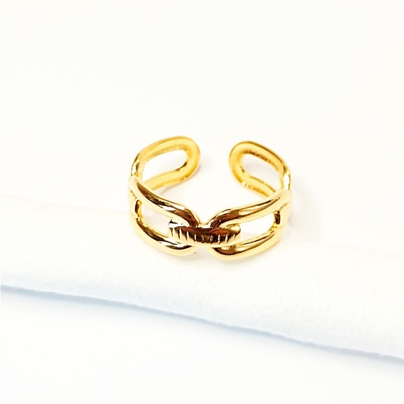Anillo de acero inoxidable, ajustable dorado con baño de 14k, diseño como eslabones de cadenas. Liso sin piedras.