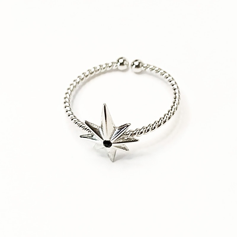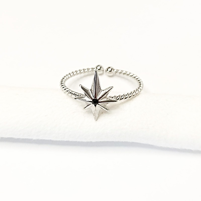 Anillo ajustable de acero inoxidable con diseño de estrella del polo norte, tiene una elegante circonita de color negro en el centro.