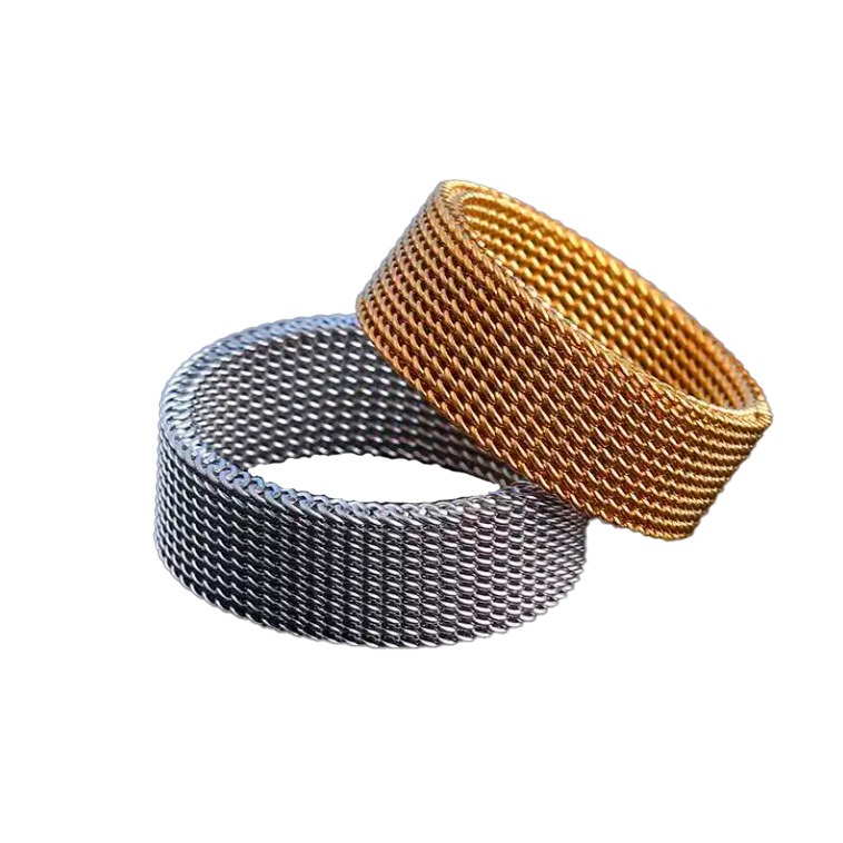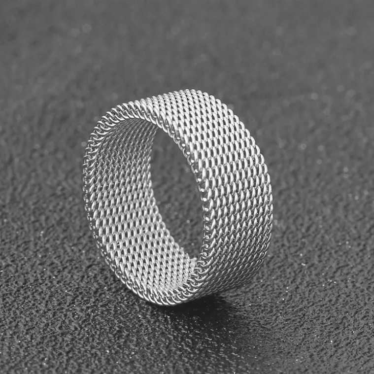 Un sofisticado anillo de malla tejida, disponible en acabados dorado y plateado. Fabricado con acero inoxidable de alta calidad, esta elegante pieza combina estilo moderno con durabilidad atemporal, siendo perfecta para los amantes de la joyería que valoran la artesanía refinada.