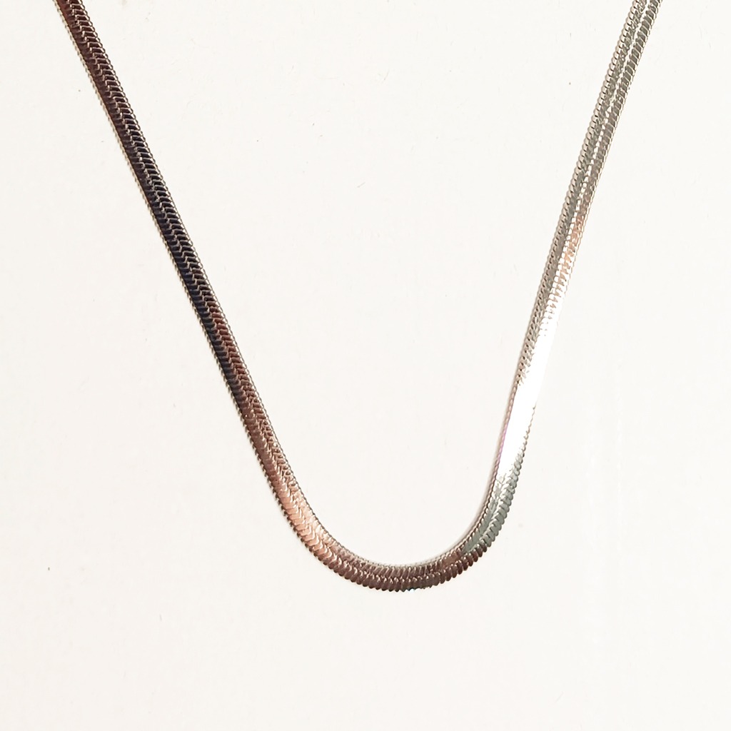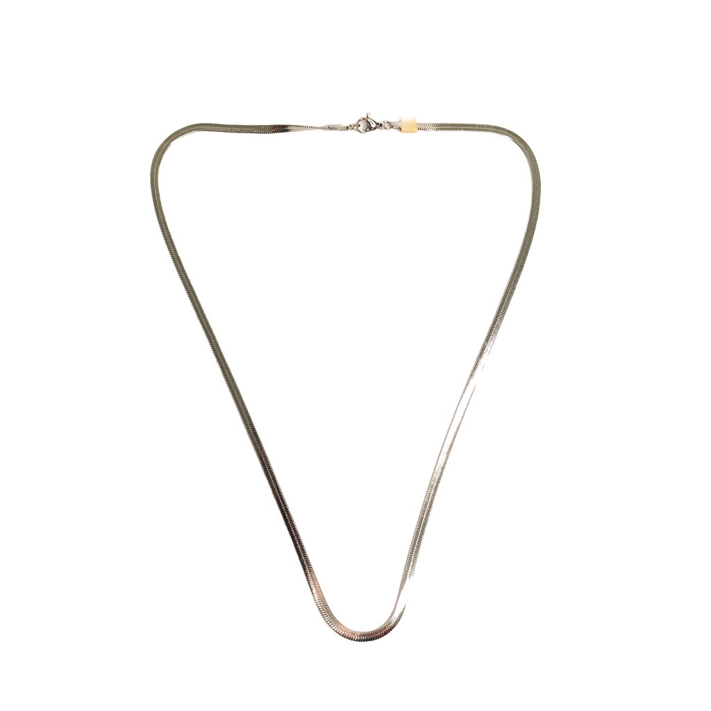 Esta cadena presenta una superficie plana y lisa que refleja la luz con gracia. Está elaborada con acero inoxidable de alta calidad, garantizando no solo una apariencia lujosa en tono plateado, sino también una durabilidad excepcional y resistencia al deslustre. Es hipoalergénica, ideal para pieles sensibles, y su diseño la hace perfecta para llevar sola como una declaración de estilo minimalista o para combinar con tu dije favorito.