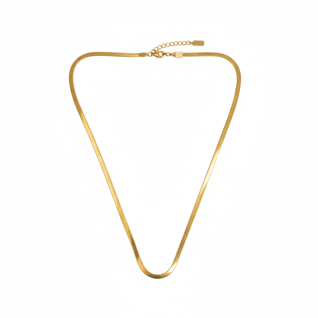 Cadena plana espejo, fabricada en acero inoxidable. Su diseño fluido y brillante la hace perfecta para llevar sola o con dijes, añadiendo un toque chic y contemporáneo a cualquier look.