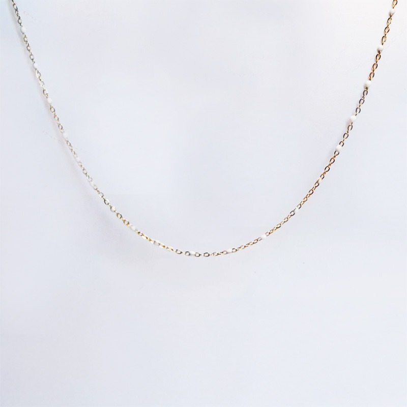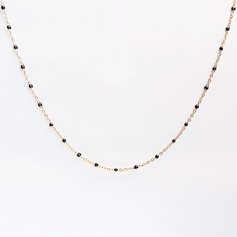 Esta pieza presenta una cadena en tono dorado adornada con cuentas facetadas en negro o blanco.