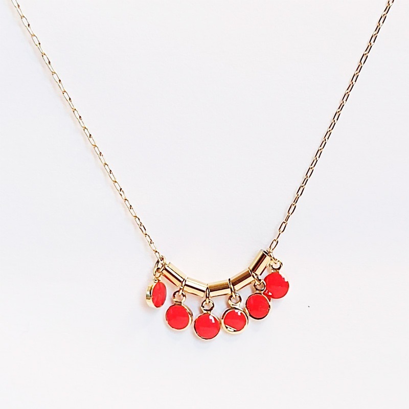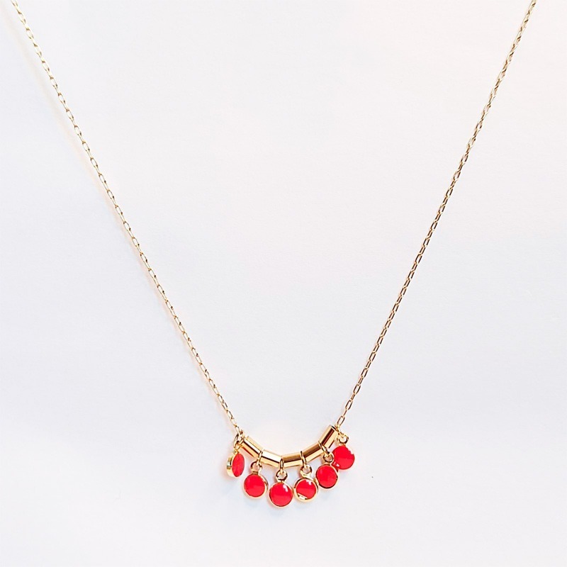 Una hermosa pieza de joyería para quienes aman la elegancia con un poco de color rojo. Elaborada con una cadena de acero dorada, esta gargantilla presenta un exclusivo diseño de barra semicircular adornado con cinco vibrantes dijes rojos que cuelgan.