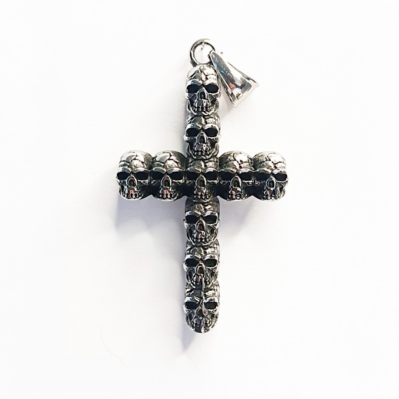 Este colgante presenta una cruz formada completamente por calaveras, simbolizando fuerza y personalidad. Diseñado para quienes adoptan la estética gótica, rockera y biker, es una muestra de actitud, individualidad y valentía.