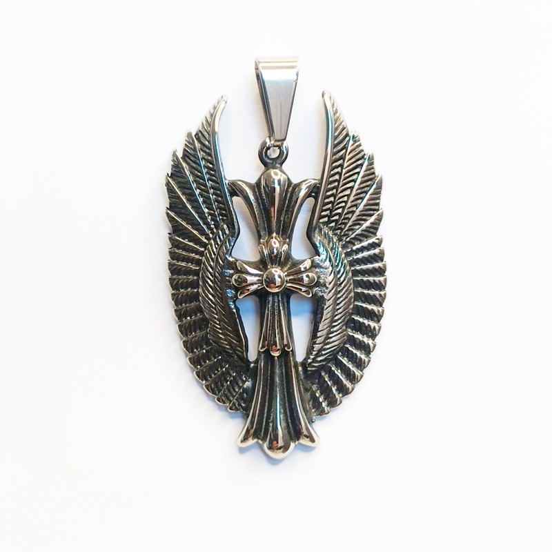 El Colgante cruz guardián esta hecho en acero con matices negros. Diseñado con alas extendidas, simboliza protección y fortaleza.