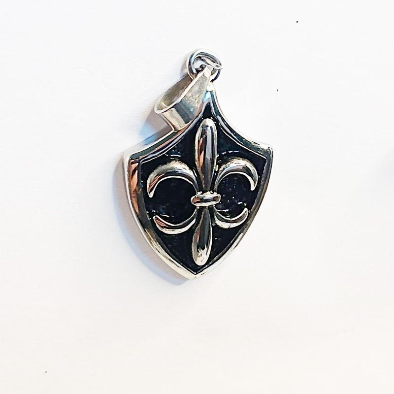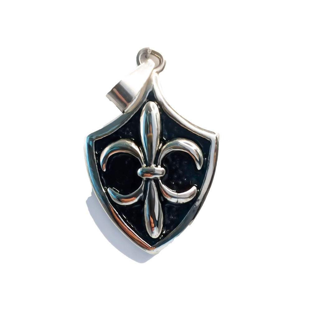 Colgante: Escudo de Fleur-de-Lis de Acero Inoxidable Inspirado en la heráldica medieval, este colgante presenta un emblema de fleur-de-lis (flor de lis) enmarcado por un fondo de escudo. El contraste entre los tonos negros y plateados le otorga un atractivo distinto, convirtiéndolo en un muy buen accesorio para mostrar coraje, fuerza y estilo.