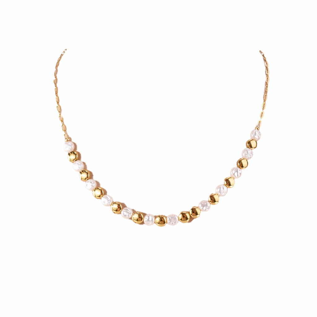 Collar de acero inoxidable chapado. La mitad de este hermoso collar tiene perlitas de río, muy delicadas y atemporales para cualquier look.
