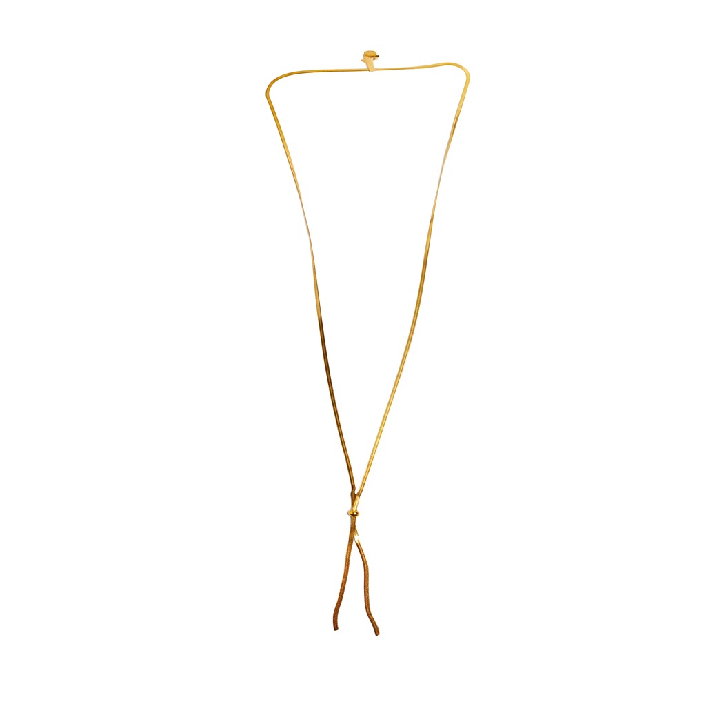 Elaborado con acero inoxidable de alta calidad y un brillante baño de oro, este collar no solo destaca por su belleza, sino también por su durabilidad. Es resistente al deslustre y al desgaste diario, asegurando que su brillo perdure con el tiempo. El diseño de cadena fina se desliza suavemente, terminando en un elegante nudo que añade un detalle chic y distintivo.