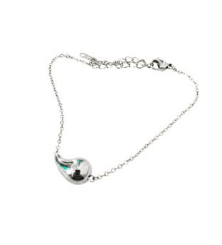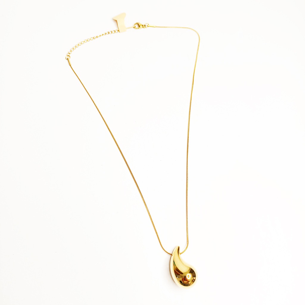 El elemento central es el llamativo colgante en forma de gota o lágrima. Este dije, con su superficie pulida a espejo, refleja la luz de manera espectacular, creando destellos cautivadores con cada movimiento. Su diseño orgánico y aerodinámico lo convierte en una pieza versátil, capaz de complementar desde un look casual chic hasta un atuendo más formal. El colgante se desliza con fluidez por la cadena, manteniendo la armonía del conjunto.
