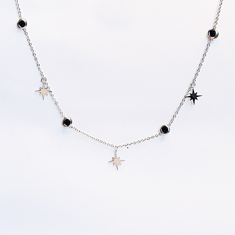 Gargantilla de acero inoxidable con delicados colgantes en forma de estrellas y circonitas negras. Un diseño elegante y versátil, ideal para cualquier ocasión.