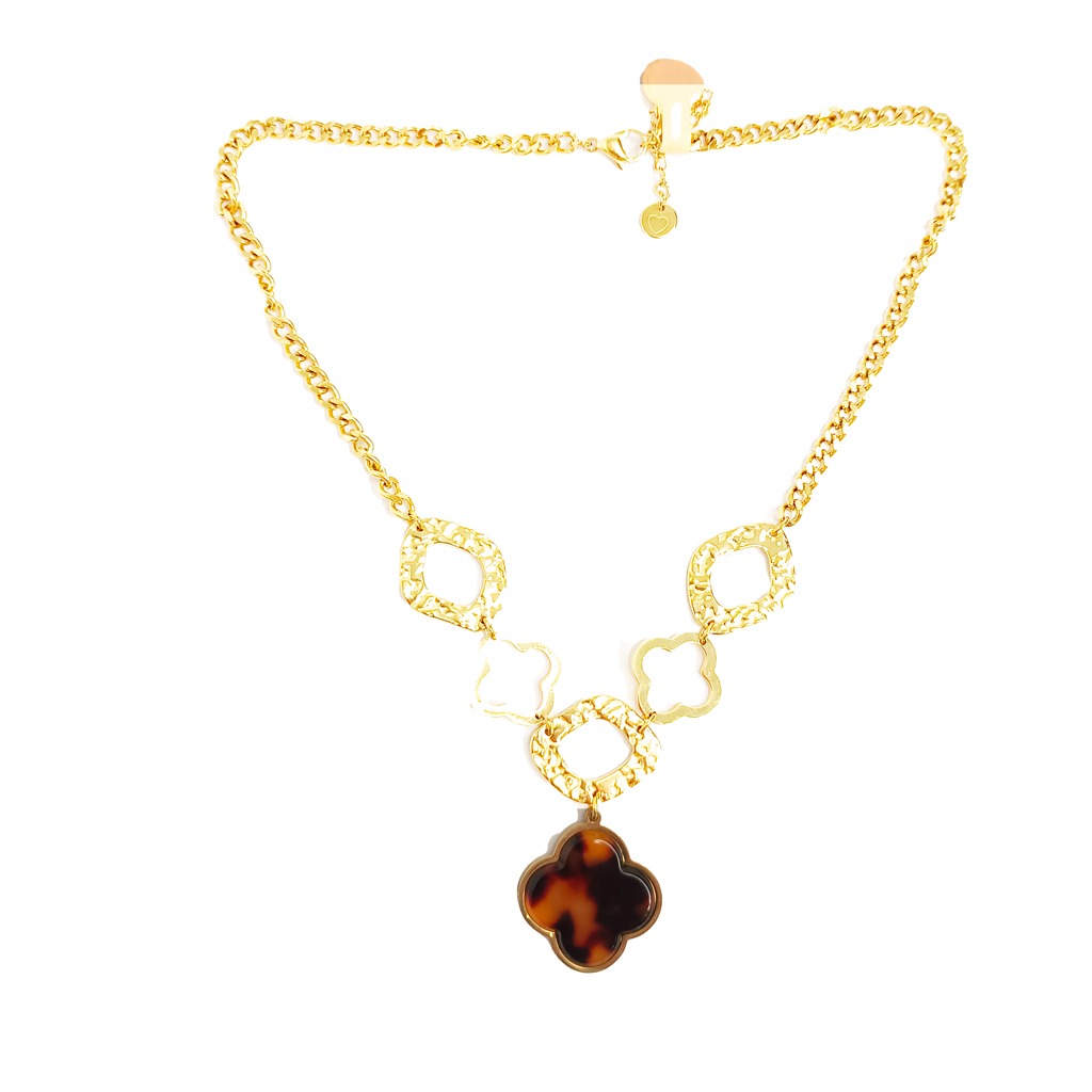 Esta exquisita gargantilla es un homenaje al estilo clásico con un giro moderno. Combina la durabilidad del Acero Inoxidable con el patrón orgánico y atemporal del efecto carey (carey sintético) en forma de trébol. Es la pieza perfecta para añadir un toque de sofisticación vintage y buena suerte a tu look.