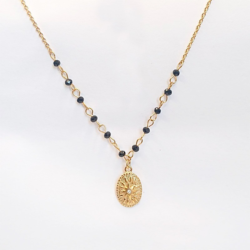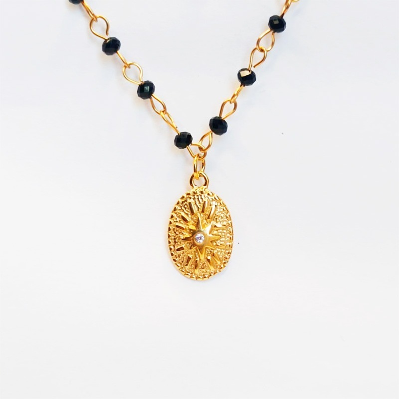 Para quienes quieran alinearse con sus valores y creencias fundamentales, tenemos la estrella polar. En esta pieza podemos apreciar piedras de polímero negras en forma de bolitas, que realza la elegancia de la gargantilla. Su estilo la hace única y versátil para cualquier ocasión