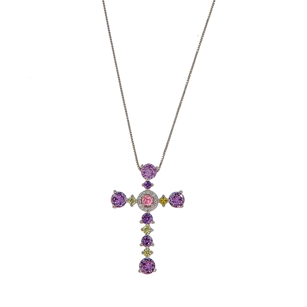Gargantilla de plata con forma de cruz, adornada con circonitas violetas en sus extremos y una llamativa circonita rosa en el centro. La combinación de la plata y las circonitas de colores crea un agradable efecto que hace que esta pieza sea única y elegante.