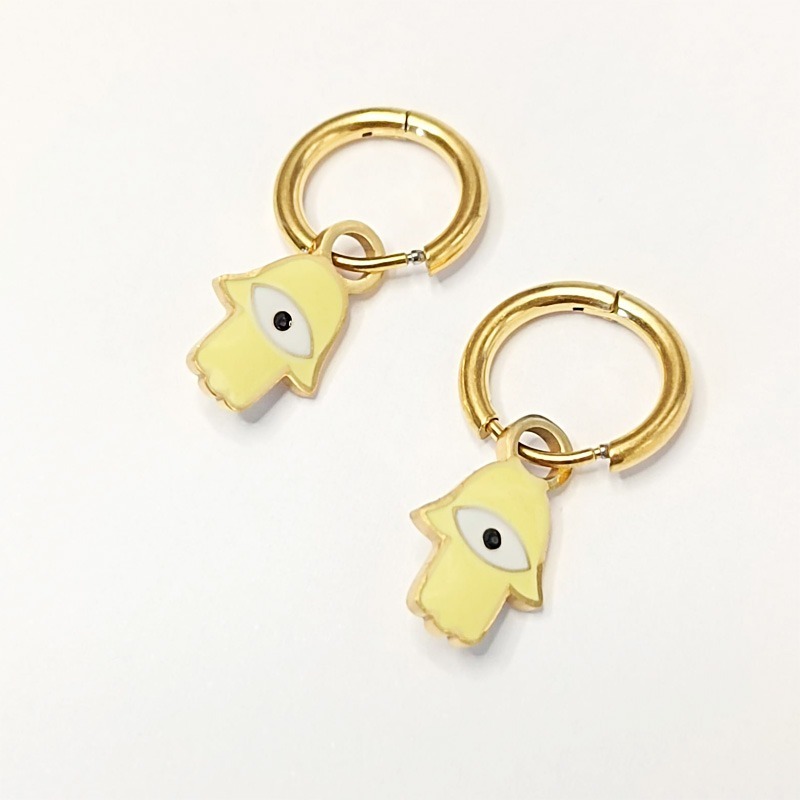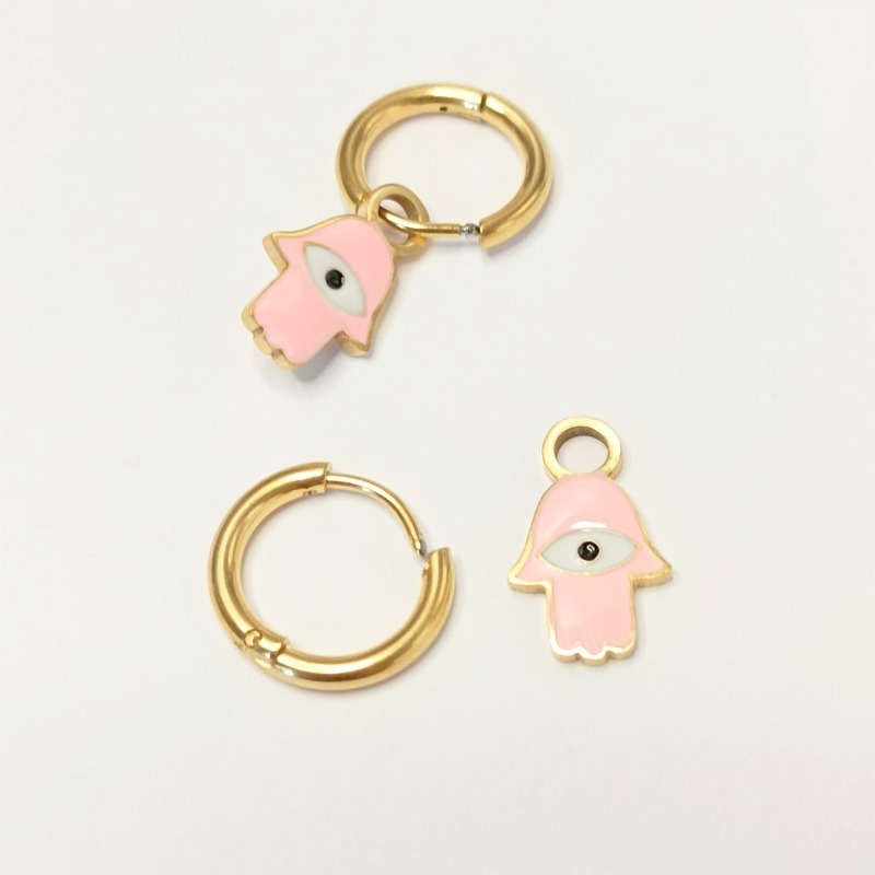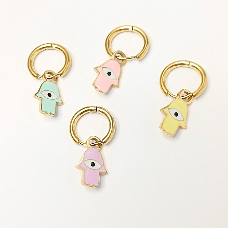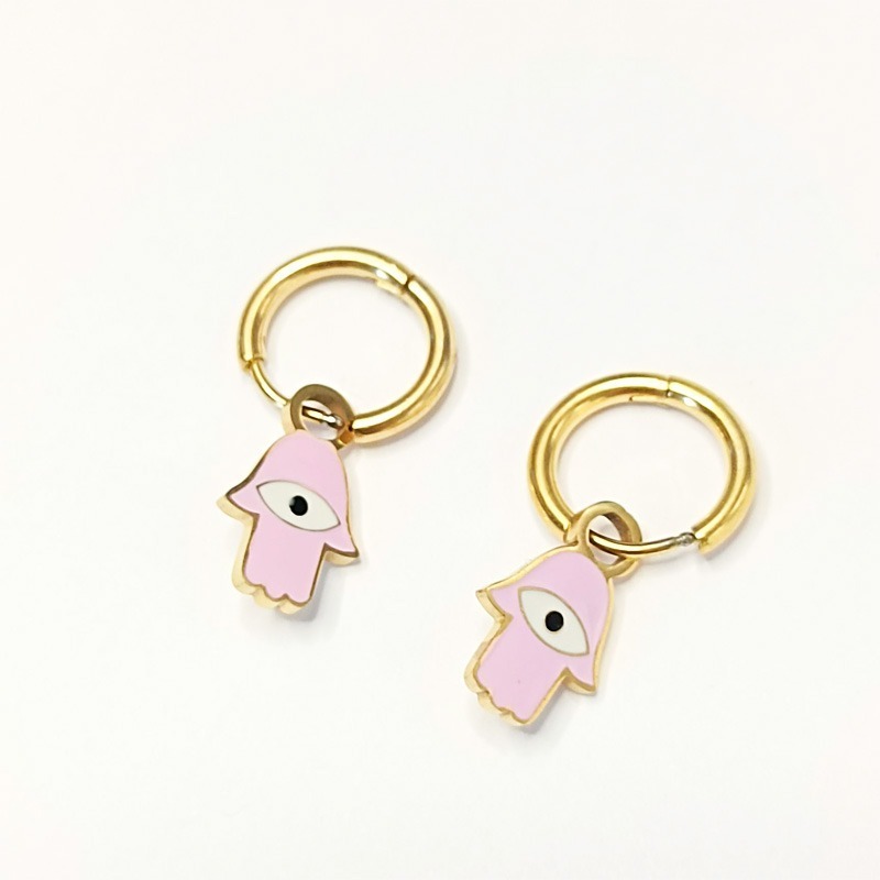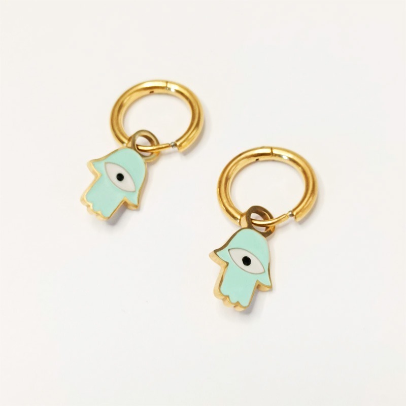 Pendientes de acero inoxidable con colgantes divertidos de la mano de Fátima y ojo de protección. Colores pastel.