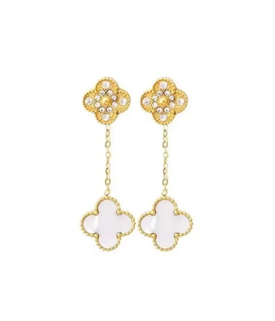 Pendientes de acero inoxidable con doble flor. Piedras circonitas y cadena colgante. Elegantes, resaltarán cualquier look.