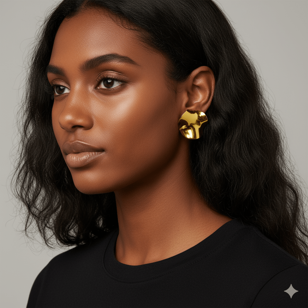 La versatilidad es la clave de estas joyas. Combínalos con un peinado recogido, como un moño alto o una cola de caballo, para maximizar su efecto escultórico y la visibilidad. Para un look más suave, llévalos con el pelo suelto y verás cómo el brillo dorado aparece sutilmente. Son el complemento ideal para un outfit de cuello alto o para equilibrar un escote en V profundo.