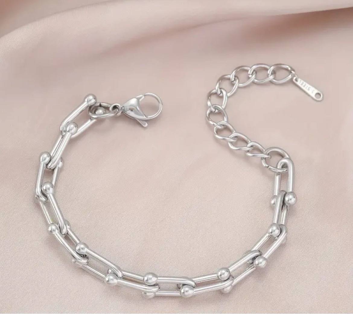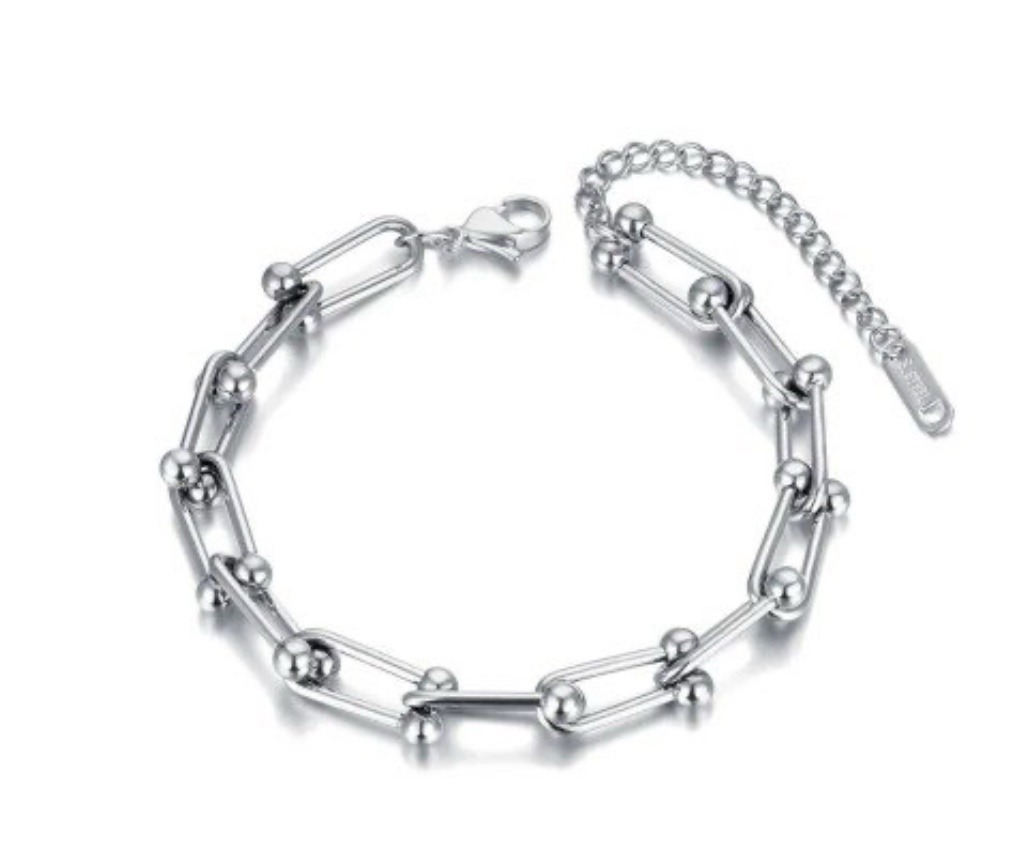 Una preciosa pulsera y resistente con eslabones de cadena. Material de acero inoxidable, cierre con mosquetón, largo de 18 cm y alargue de 5 cm.