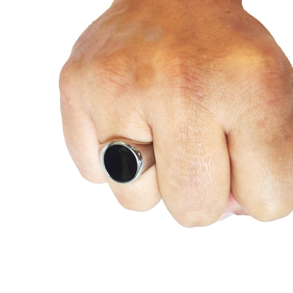 Anillo de acero con esmalte en color negro. Ideal para las personas amantes de las rutas, viajes y aventuras por el mundo.